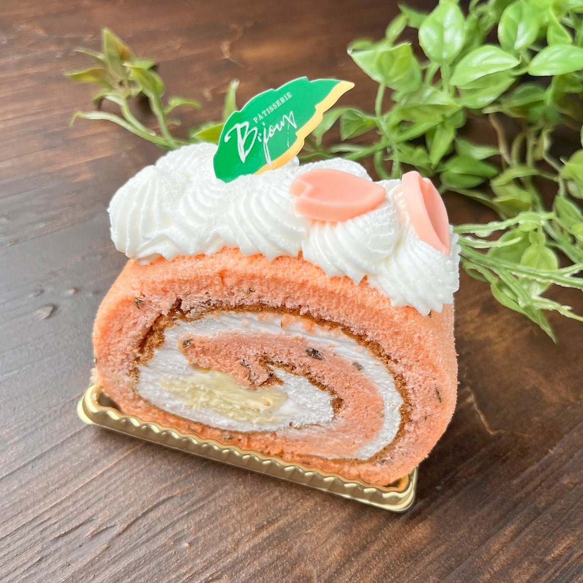 生地に桜葉を刻みほんのりピンク色に焼き上げ、ふわりと微香を放つ桜の生クリームを巻き込みました。